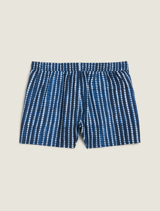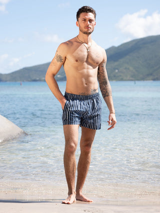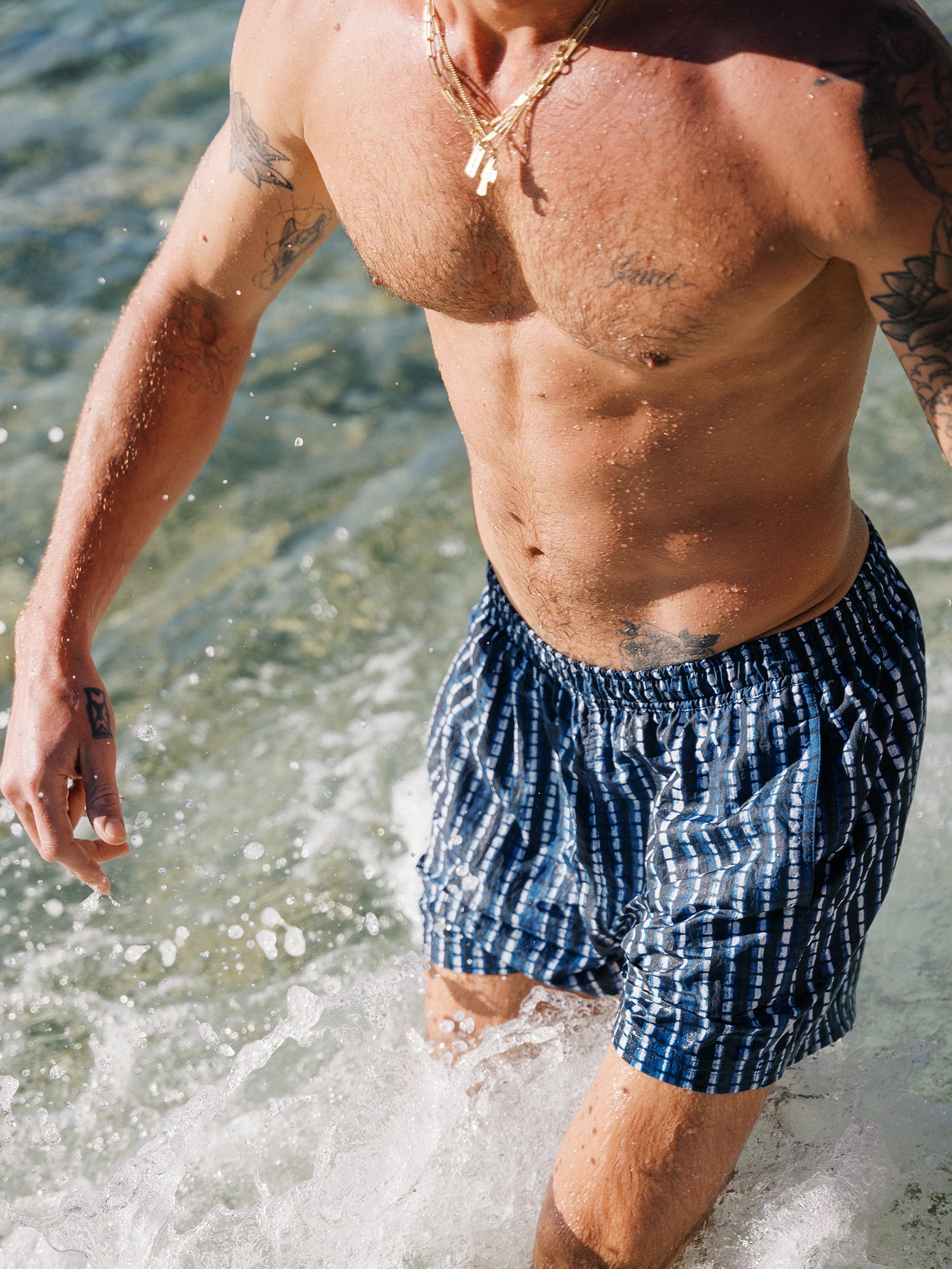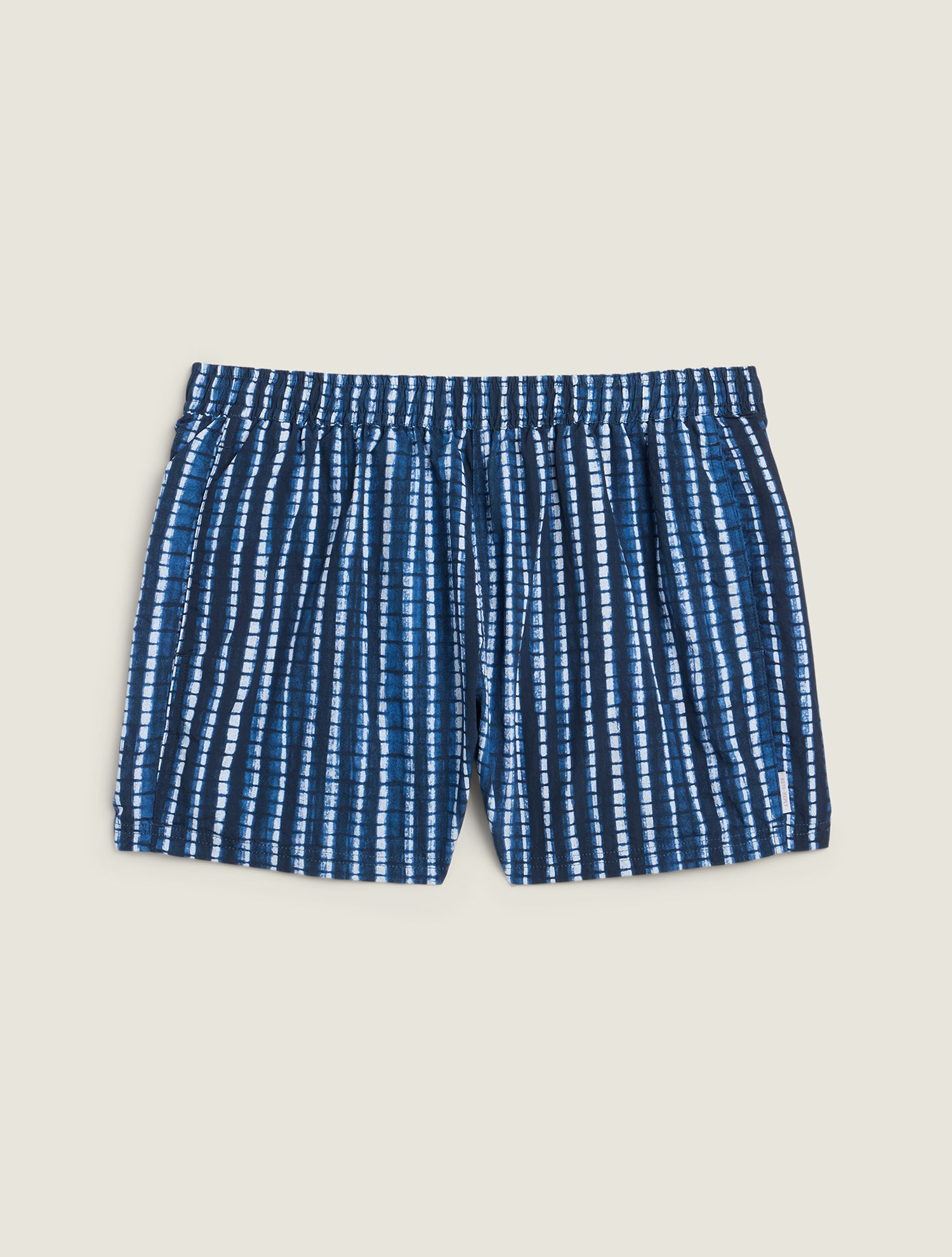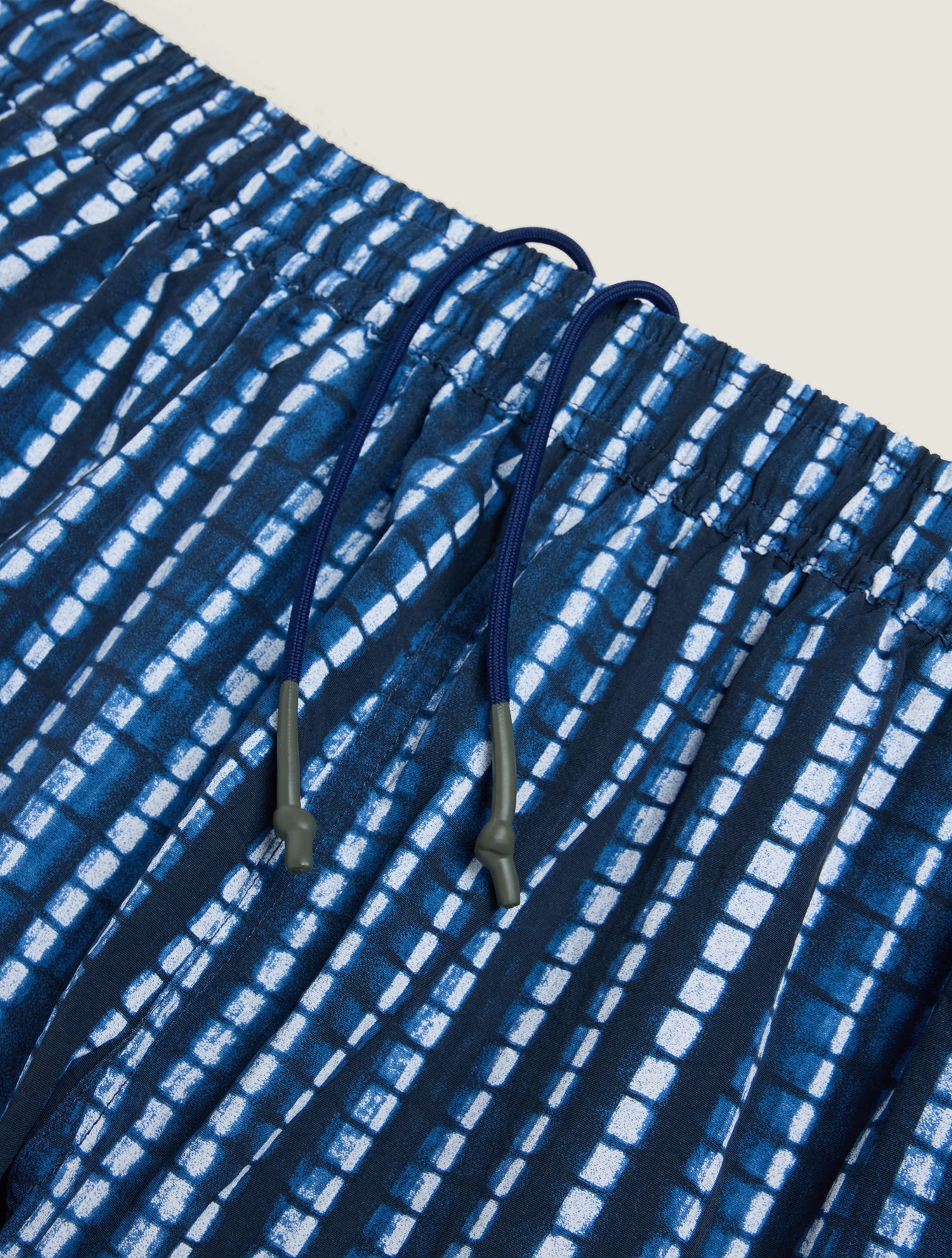 Sebastian 4” Printed Nylon Swim Trunks Batik Check, Lapis