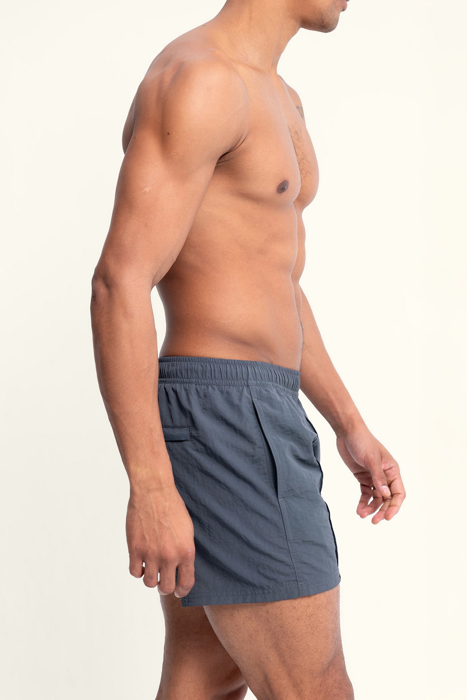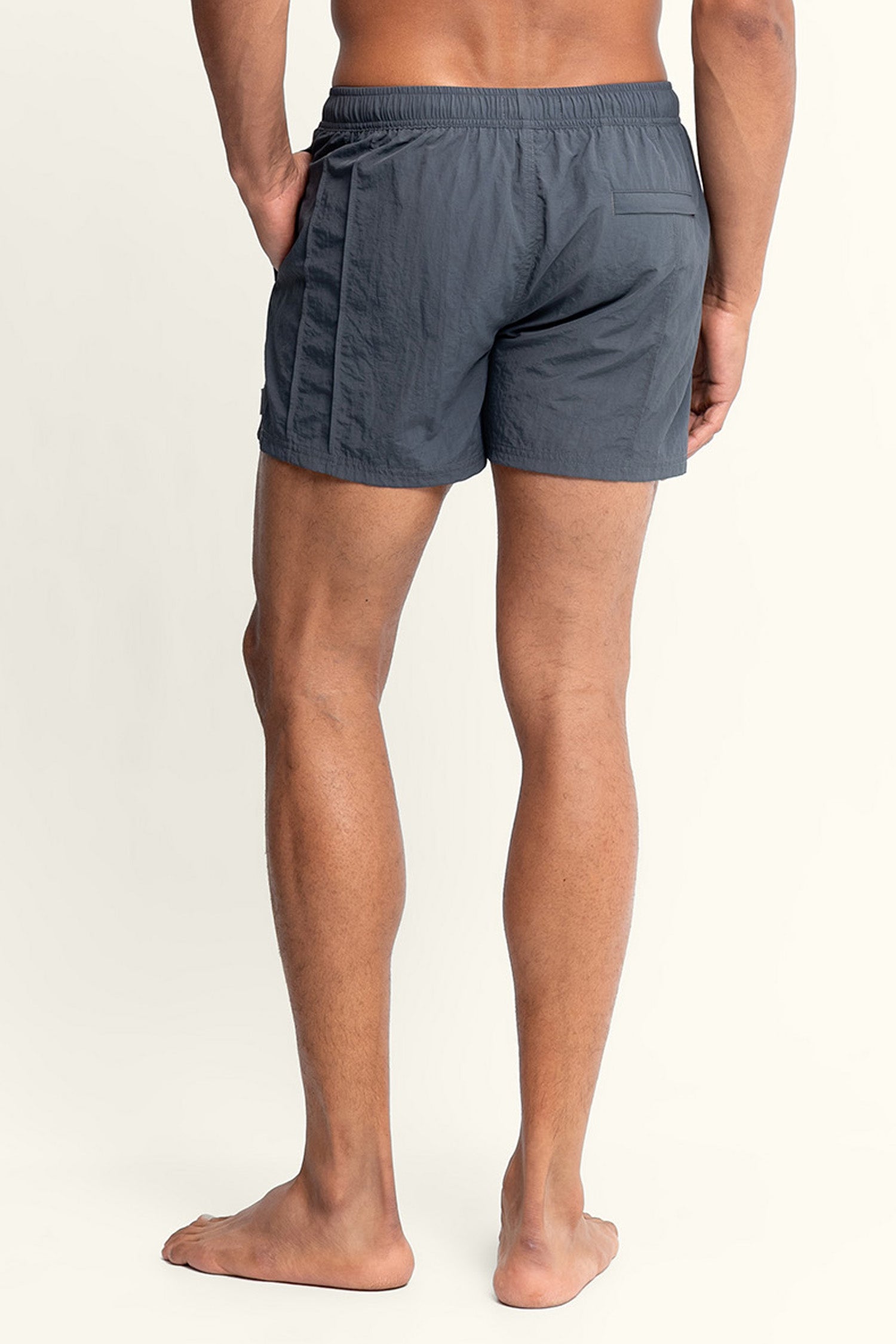 Crafted from premium cotton-touch nylon for exceptional comfort and durability, these swim trunks feature a signature vertical pintuck that adds understated texture and depth. The streamlined silhouette and quick-drying fabric allow for an effortless transition from swim to off-hours wear.